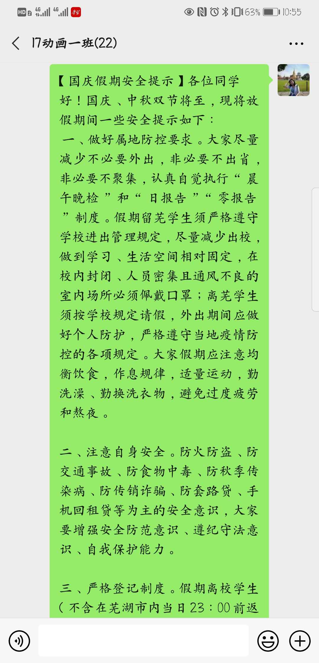 2020年国庆、中秋恰逢一天,双节将至,为做好员工放假期间安全教育管理,17网新、动画专业班级根据毕业班实际情况,在节前通过班内安全提醒、寝室安全检查、晨午晚检抽检、今日校园假期去向收集等形式,做好常态化疫情防控下的管理。