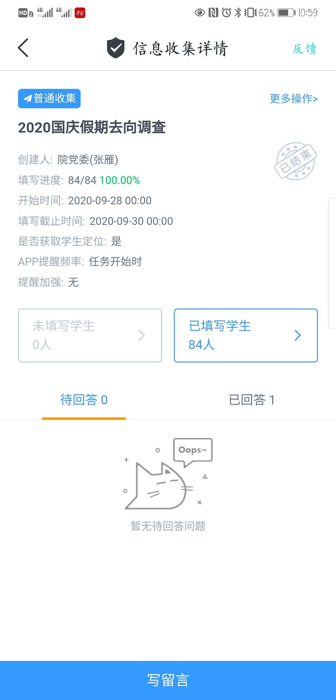 进行双节假期去向统计和安全提醒。结合“今日校园”APP,统计了全部同学国庆假期的去向、离返校时间、交通方式、紧急联系人等信息,要求大家保持通讯畅通,在班级群内做好通知、提醒工作,提醒大家尽量减少不必要外出,非必要不出省,非必要不聚集,认真自觉执行“晨午晚检”和“日报告”“零报告”制度。注意提升防火防盗、防交通事故、防食物中毒、防秋季传染病、防传销诈骗、防套路贷、手机回租贷等为主的安全意识,要增强安全防范意识、遵纪守法意识、自我保护能力。