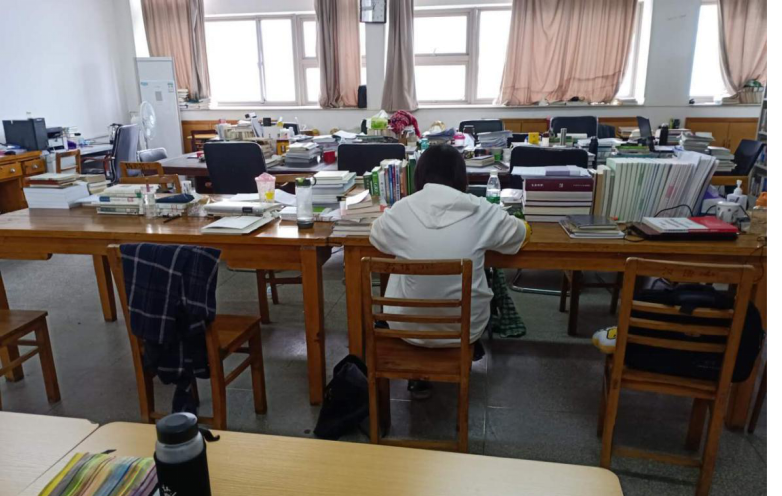 (图为王成成拍摄的资料室整理后的书籍与努力学习的学姐)