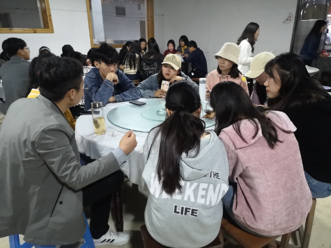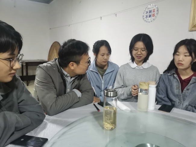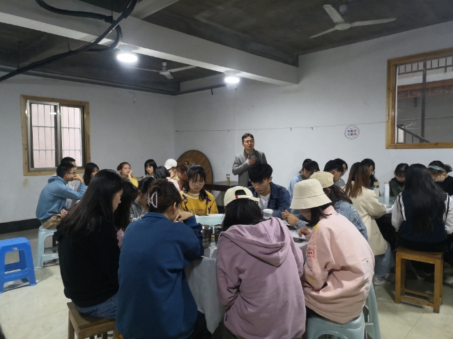 10月17日下午4时,受公司委托从公司赶往采风一线黟县屏山村的2019级广告学辅导员老师马星宇未顾上休息,就在听取班委工作报告后主持召开了一场主题为如何在社会实践中认识社会的主题班会。受于现场场地、设施的局限,大家因漏就简在用餐的饭堂里席桌而座,认真聆听辅导员老师就采风调研、团队建设、班级发展展开的指导。
