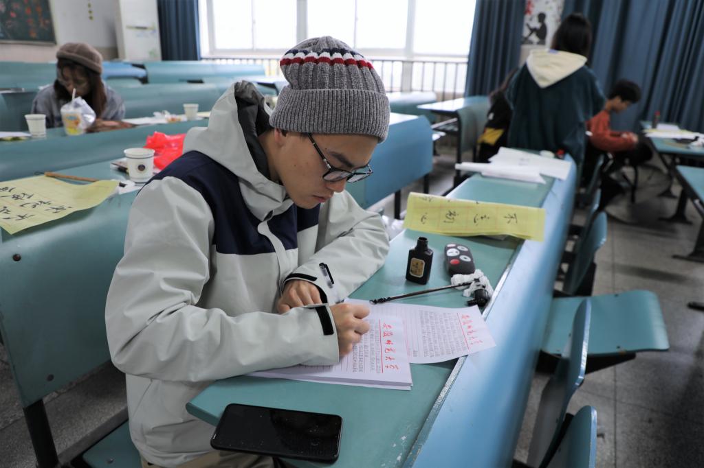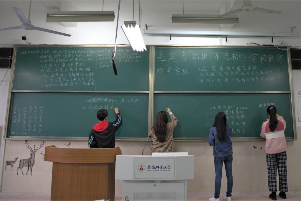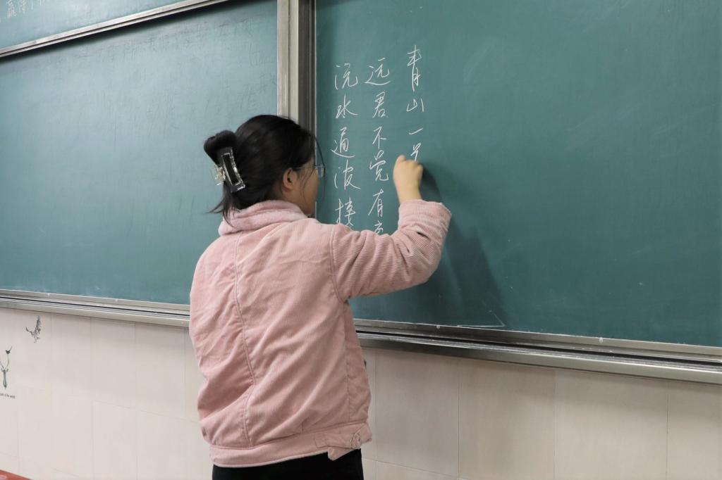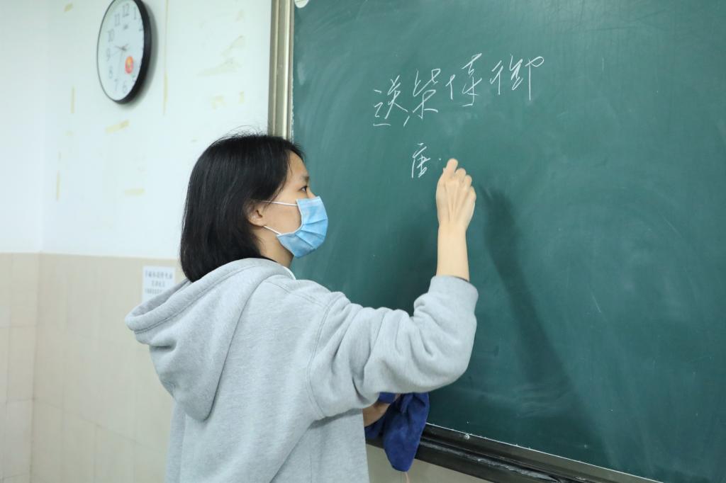 比赛分为三个项目进行:硬笔字、毛笔字、粉笔字。参赛选手需在现场书写,在完成一个项目后可自行进行下一个项目,全部项目结束后,选手即可自行离场。赛前,工作人员将本次比赛需要书写的内容写于黑板,并准备好备用纸笔,以保证比赛的顺利进行。上午九时许,比赛开始,参赛选手在纸上认真书写,在硬笔字、毛笔字结束后,参赛选手在黑板上依次写下粉笔字内容。各位选手笔酣墨饱,书写风格不同,有的行云流水,落笔如云烟;有的果敢坚毅,运笔神采动人。与此同时,院团委员工会工作人员也认真监考,提醒选手相关注意事项,并在参赛选手需要时热情提供帮助。