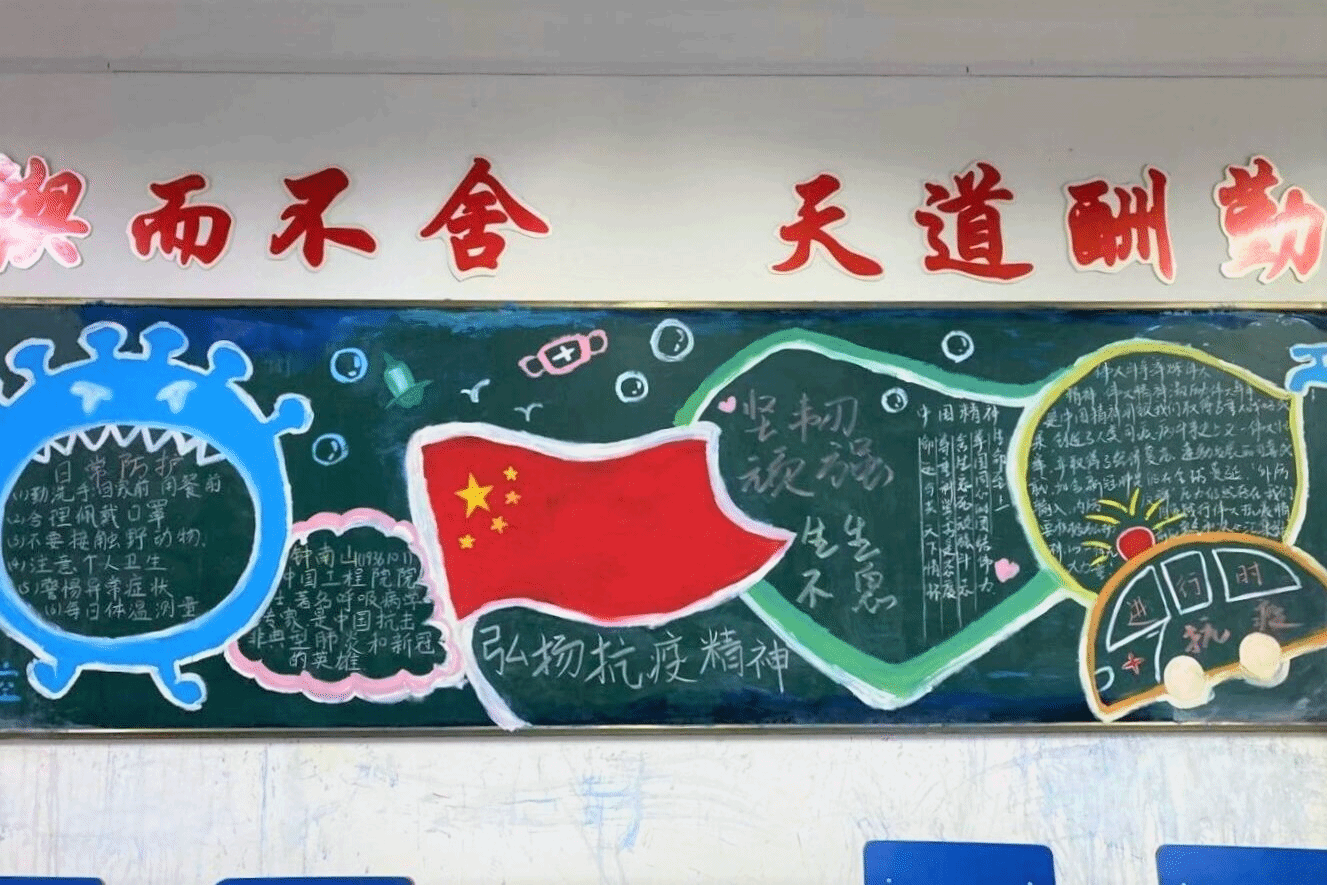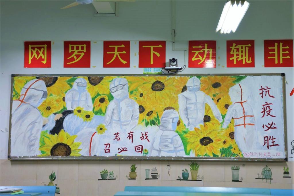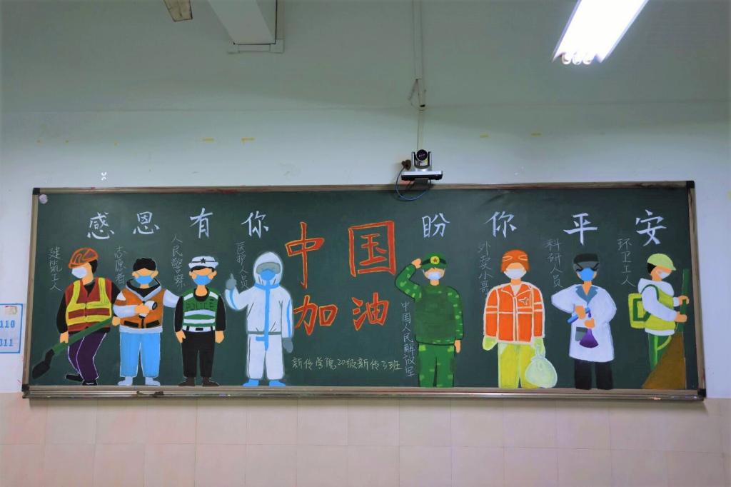 据悉,本次板报围绕三大主题展开:“弘扬伟大抗疫精神”、“纪念中国人民志愿军抗美援朝出国作战70周年”、“学习十九届五中全会精神”。各班需要从三个主题中任选一个主题进行板报制作。各班板报紧扣主题,设计丰富多样,给最初单调的黑板带来了不一样的色彩,充分展现了新传人的青春活力。19级播音与主持艺术班板报“抗击疫情,从我做起”以象征希望的救护车、医生、针管和桃花为背景,主要介绍了疫情传播途径,提供了防范小贴士,提醒同学们对待疫情一定不能松懈。19级摄影班板报“征途”用绘画先声夺人,让评委老师和同学一进门就被“最美逆行者”的人像所吸引。“寒冬终将过去,春暖花会再开。”板报满是同学们对全体逆行者的感谢。20级新闻传播学类3班板报“感恩有你,盼你平安”画出医护人员、外卖小哥、环卫工人等八种典型人物形象,向抗疫人员表达感谢。近期,十九届五中全会召开,学子们积极学习大会精神,并在黑板报上有所体现。20级新闻传播类1班板报“不忘初心,牢记使命”,以红色调为主,绘制了中国地图、天安门等标志性建筑,简单介绍了会议的内容和精神,向同学们提出了建设美丽中国的美好愿望。各班通过不同主题,全方位表达了自己的爱国情怀。