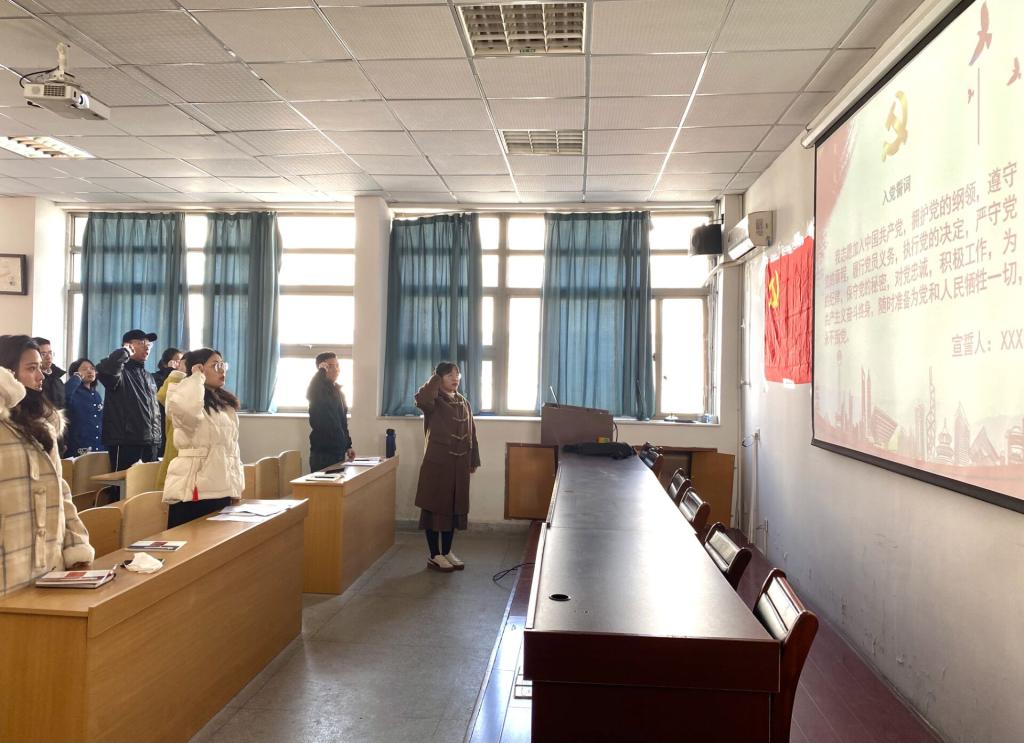 在国际歌之后,由支委王璐妍带领新党员宣誓。“我志愿加入中国共产党,拥护党的纲领,遵守党的章程,履行党员义务,执行党的决定,严守党的纪律……”与会党员佩戴党员徽章,面向鲜红的党旗,精神饱满。他们右手握拳过肩,铿锵有力地发出了承诺和誓言。