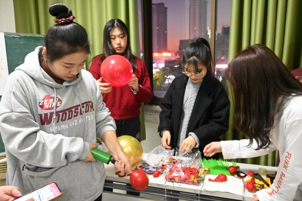 晚七点,元旦晚会准时开始,班长董雨欣同学主持整场晚会。首先,班委给每个同学分发了一张明信片,每位同学在上面写上新年祝福语,随后由班委随机装进为同学们准备好的礼物盒中,以便每一位同学都能收到来自其他同学的新年祝福,礼物盒中还包括一个玻璃杯和小零食。接下来就是游戏环节和才艺表演环节,参加游戏环节的所有同学都由主持人随机抽取,更加有利于让不太熟悉的同学一起玩游戏增进感情,每位获胜的同学都会获得一个小玩偶作为奖品。第一个游戏便是你画我猜,十分考验同学们的默契。第二个环节是节目表演,分别是刘皖蒙和许金柔同学带来的歌曲《Last Dance》,瞬间暖场;黄楚婷、魏文君和何锦丽三位同学带来的歌曲《你要跳舞吗》,带动同学们合唱;范悦铃和郭宜璐同学带来的舞蹈《Helicopter》,同学们疯狂打call;朱慧婷和薛蕴晨同学带来的《Mr.Bentley》,一段rap让现场气氛更加兴奋。第三个游戏环节是报数字叫名字,十分有趣。第四个又到了表演环节,分别是毛玉婷、洪璇、刘慧慧和李欣茹同学带来的《去年夏天》,孙岚琪同学带来的《刻在我心底的名字》,董雨欣、孙璇和郭宜璐同学带来的《十二月的奇迹》,吴一凡同学还带来自己的吉他弹唱。最后一个游戏环节是爱的抱抱,正如它的名字,这个游戏充满爱。