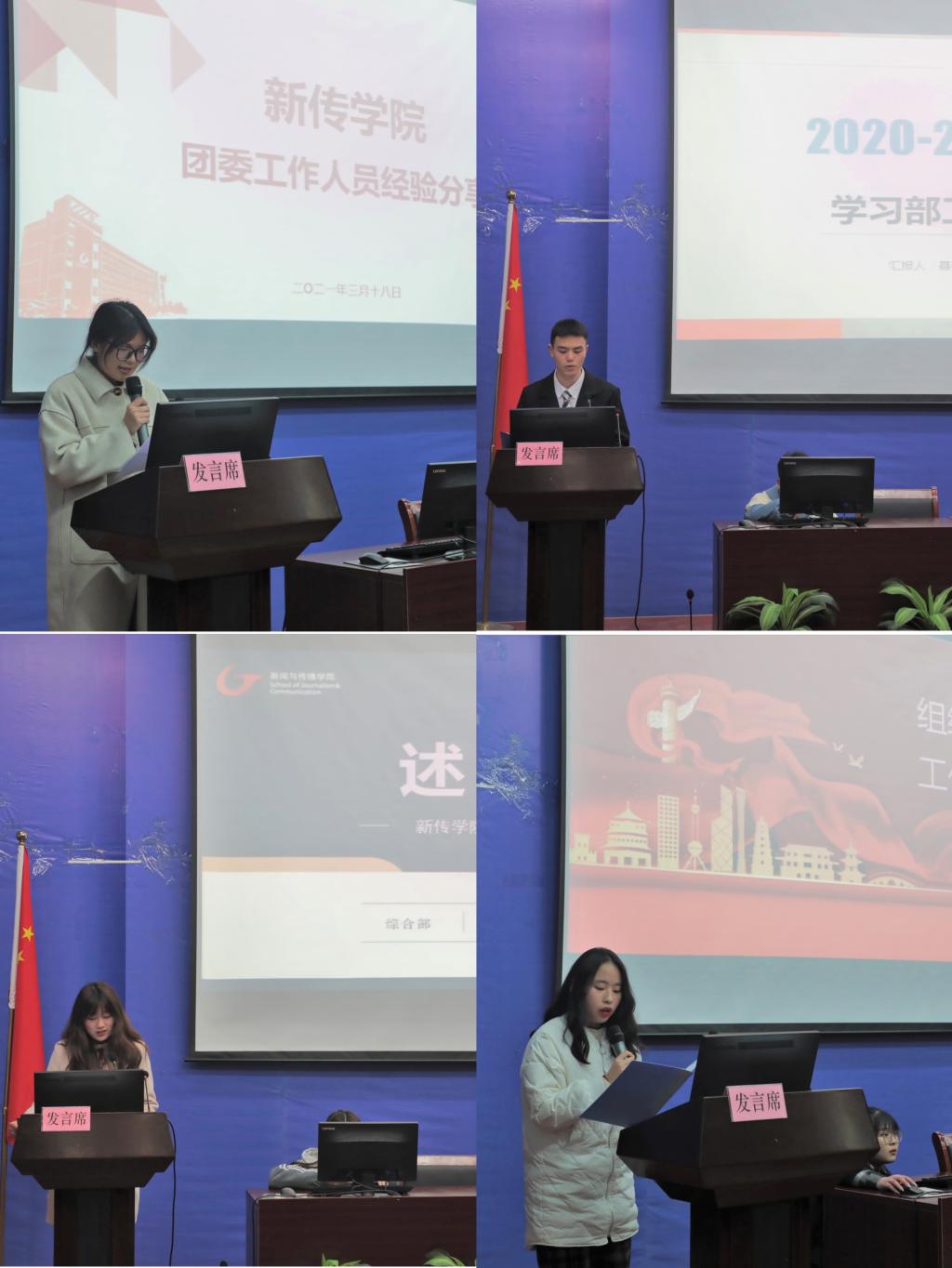 首先由主席团王儒钰进行发言,2021年是王儒钰在TapTap点点学习的第三年,也是她在院团委员工会工作的第三年。她说,在员工会工作的这些时光,她将终身收藏、终身受益。王儒钰从思想、工作、学习和感悟收获这四个方面进行自我总结,“我会尽自己最大的努力站好最后一班岗,不忘初心,方得始终。”这是作为主席团成员的一份责任与担当,也是作为新传学子的一份热爱与赤诚。接下来是来自2018级摄影专业的胡甜甜,作为主席团成员,胡甜甜认为在疫情背景下,自己其实缺少了许多实地工作经验,也许工作中会遇到许多问题,但耐心沟通之后,“从不熟悉到熟悉”、“从不懂到懂”、“从不会到会”,她说,我们一定要牢记自己的责任和义务,尽职尽责,担起自己肩头的那份骄傲。“我们要保持一颗向上的心,继续在员工会这个大家庭中绽放自己的光彩。”主席团成员章海钰是2018级播音与主持艺术专业的一名员工。在他的述职报告里,“勇往直前”被分为有趣又直接的四部分,即开端的“勇”、过程为“往”、对过程的补充是“直”、憧憬的未来则为“前”。