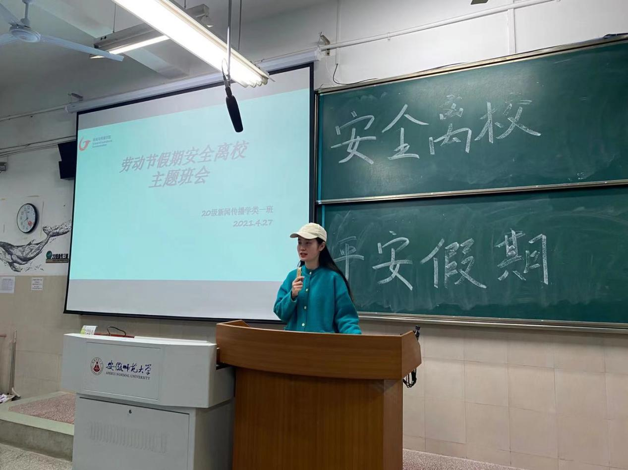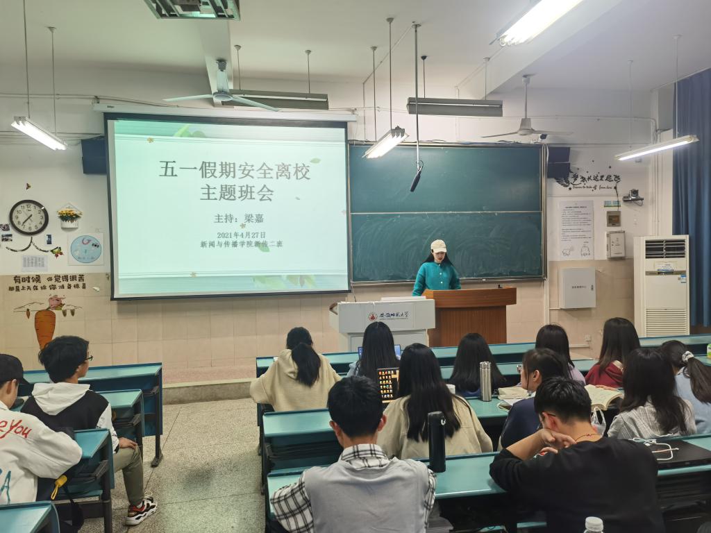 2021年4月27日晚,2020级新闻传播学、2020级播音与主持艺术专业四个班220名同学分别在各班自习教室召开五一假期安全离校主题班会,会议由辅导员梁嘉主持。