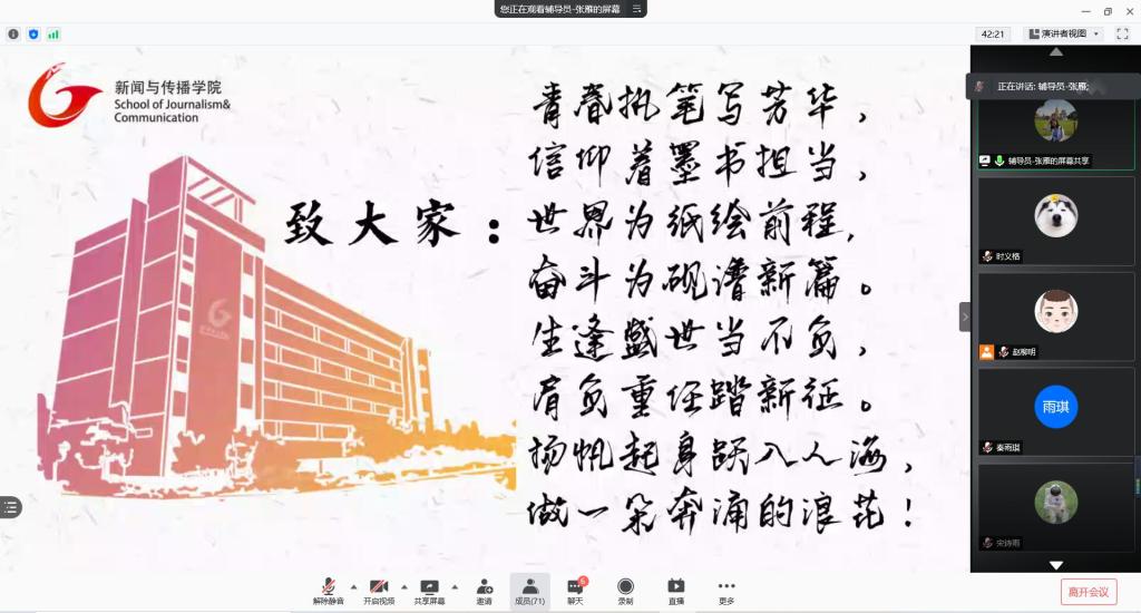 张雁从线上办理离校程序、费用结算、在校期间疫情防控等方面进行了提醒,在网络安全、就业安全、人身安全、信息安全、交通安全、财产安全及防火防盗等意识进行强调,提醒大家及时在学信网、学位网等查询本人学籍相关信息,及时转接个人党团组织关系。同时要求大家在校期间坚持做到“六个一”、“三留下”,希望大家能够用积极向上的精神风貌为母校再添一笔美丽的色彩。