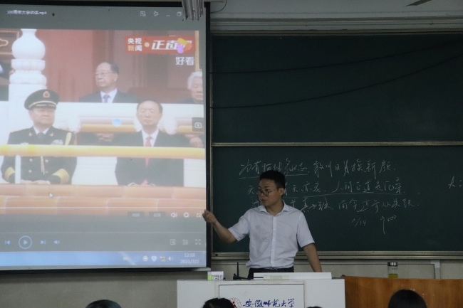 马星宇老师以毛泽东主席的三句诗句回顾了建党百年的光荣历史——“为有牺牲多壮志,赶叫日月换新颜。”“天若有情天亦老,人间正道是沧桑。”“雄关漫道真如铁,而今迈步从头越。”他结合建党一百周年庆祝大会,提醒同学们认真学习习近平总书记在大会上的讲话。他说,今天的美好生活与我们党卓越的治国理政能力分不开,与我们党一心为民的服务宗旨分不开,与我们党领导全国各族人民勠力同心分不开,希望大家在建党百年的峥嵘历史中更加坚定“四个自信”,明确四个正确认识,增强听党话跟党走的信念和信仰,积极要求加入党组织。