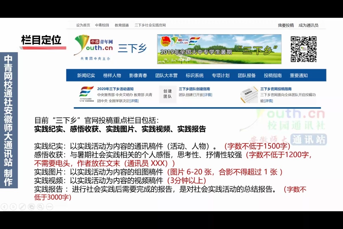 李林向各支暑期社会实践队伍分别介绍了关于中国老员工在线TapTap点点官方网站校园通讯站投稿的前期要求、投稿方式和稿件审核等工作,钱佳佳为各支队伍做了关于中国青年网三下乡活动的专题培训,从培训导入到平台介绍、从栏目定位到团队报备细致地为同学们介绍了活动的前期工作和中期要求,其中着重指出了稿件成功发表的三个基本要求,强调出“实践纪实”的重要性。
