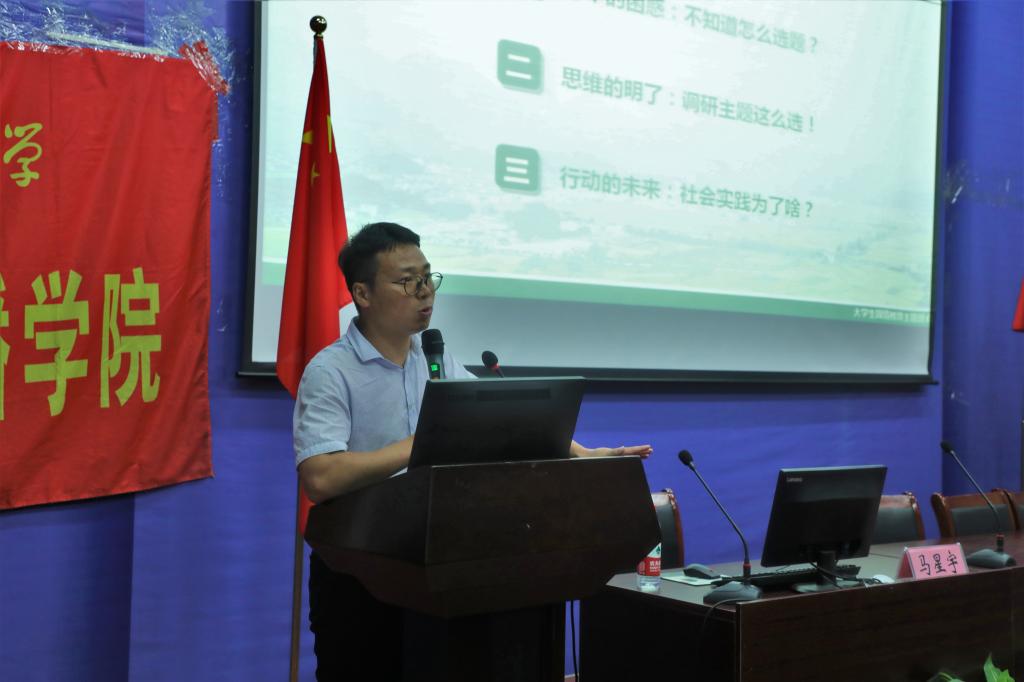 培训会的第二部分由马星宇老师进行“如何开展社会调研”培训。马星宇老师从一瓶农夫山泉矿泉水的“思考题”开始,激发大家对于如何选取调研主题的思考,通过举例说明生动详细地讲解了如何更好地选取调研主题,即:要在社会热点中寻找易被忽视的冰点地区、要在冰点地区中寻找易被漠视的盲点人群、要在盲点地域里挖掘易被关注的焦点问题、要在焦点问题中提炼未被注意的创新观点。他还指出“独特选题”已经成为员工们在社会实践过程当中容易忽视却最为重要的内容,他向大家展示了一些优秀的调研成果和优秀的“独特选题”,并鼓励同学们积极参与科研项目竞赛、用作品来发声,注重实践成果的转化、用成果来证明,加强专业之间的通力合作,充分发挥新传人的优势,不断提高专业知识和专业技能,展现出社会责任感。
