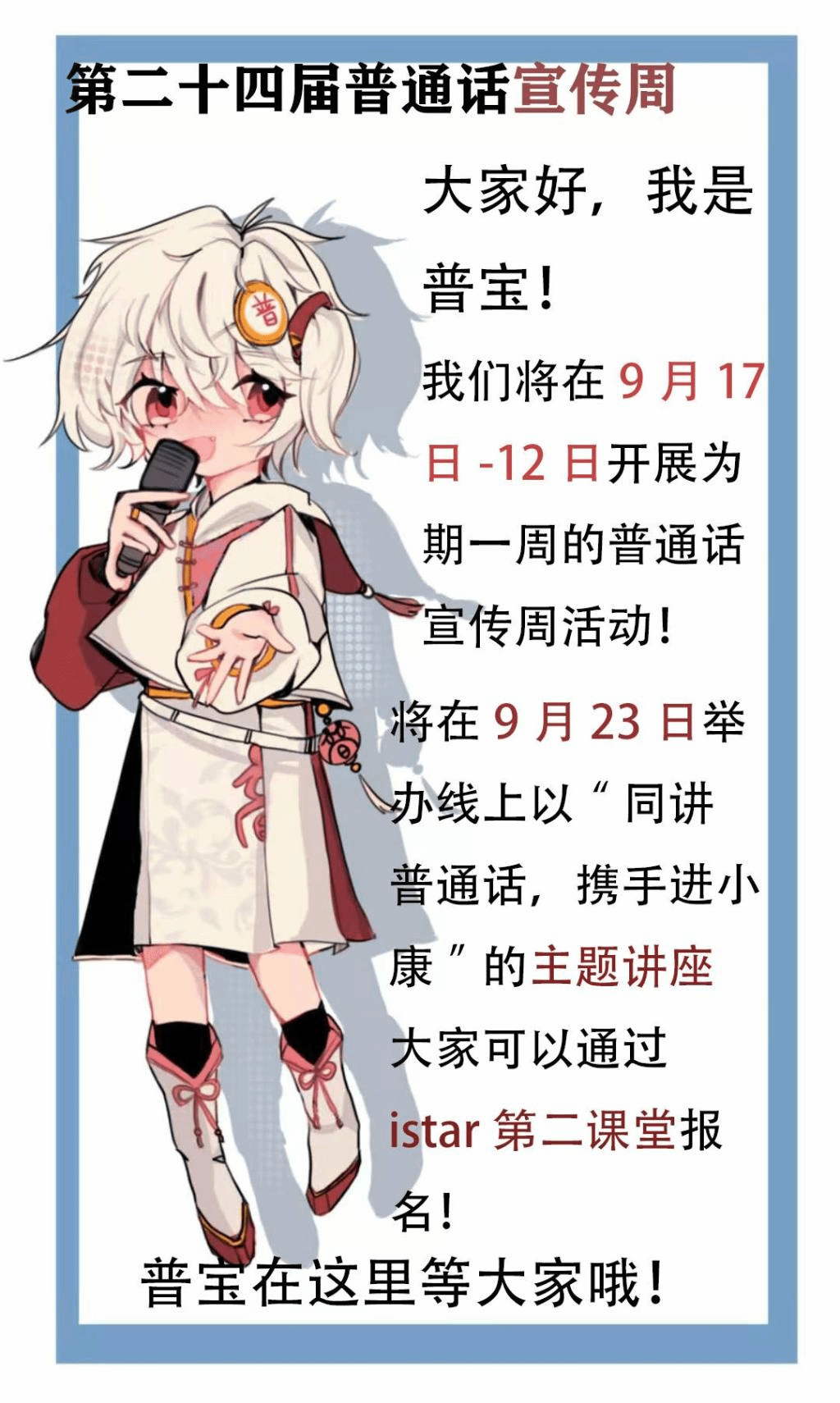 普通话是情感的纽带,沟通的桥梁。当普通话真的成为联合国六种工作语言之一,成为外国人争相学习的热门语言时,它已不再仅仅是交流的需要,它还代表着中华民族的日益强大。2021年9月13日—9月19日是第24届全国推普周,此次推普周活动的主题是普通话诵百年伟业,规范字写时代新篇。