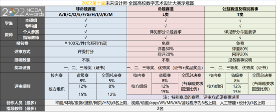 按照全国高校数字艺术设计大赛(NCDA)大赛组委会规定设定项目,共分设“非命题”“公益”“命题”三个赛道,作品类别含视觉传达设计、动画与视频设计、交互设计、人居环境规划与设计、工业产品设计、时尚设计、虚拟IP及表情包设计、数字绘画、游戏设计、数字摄影、数字音乐、人工智能+设计等。具体详见如下网站: