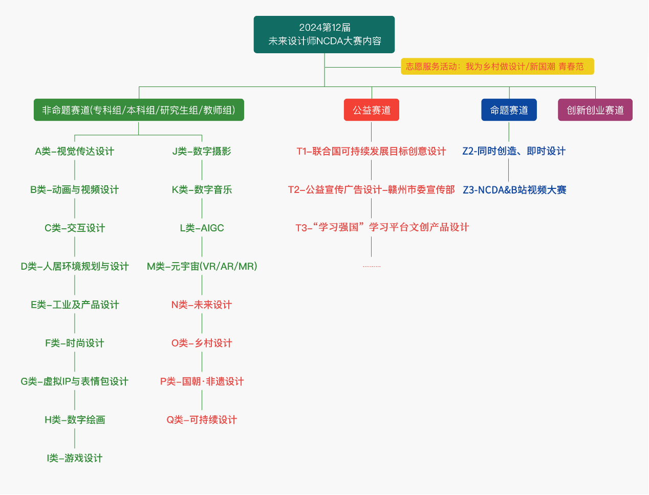 按照全国高校数字艺术设计大赛(NCDA)大赛组委会规定设定项目,共分设“非命题”“公益”“命题”“创新创业”四个赛道,内容有乡村设计、可持续设计、元宇宙+设计、未来设计、国潮·非遗设计AIGC、视觉传达设计、动画与视频设计、交互设计、人居环境与规划设计、工业产品设计、时尚设计、虚拟IP及表情包设计、数字绘画、数字摄影、数字音乐等。具体详见官方网站。