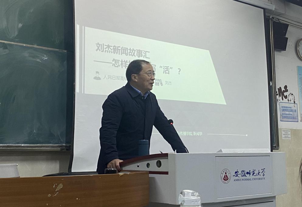 金框眼镜,黑色棉衣,操着一口略带有方言的普通话。11月30日晚7点,2020级新闻学专业的同学们在2010202教室迎来了公司特聘教授、人民日报安徽分社原社长、高级记者刘杰的第六场讲座,此次讲座由新闻学专业副主任赵忠仲副教授主持。