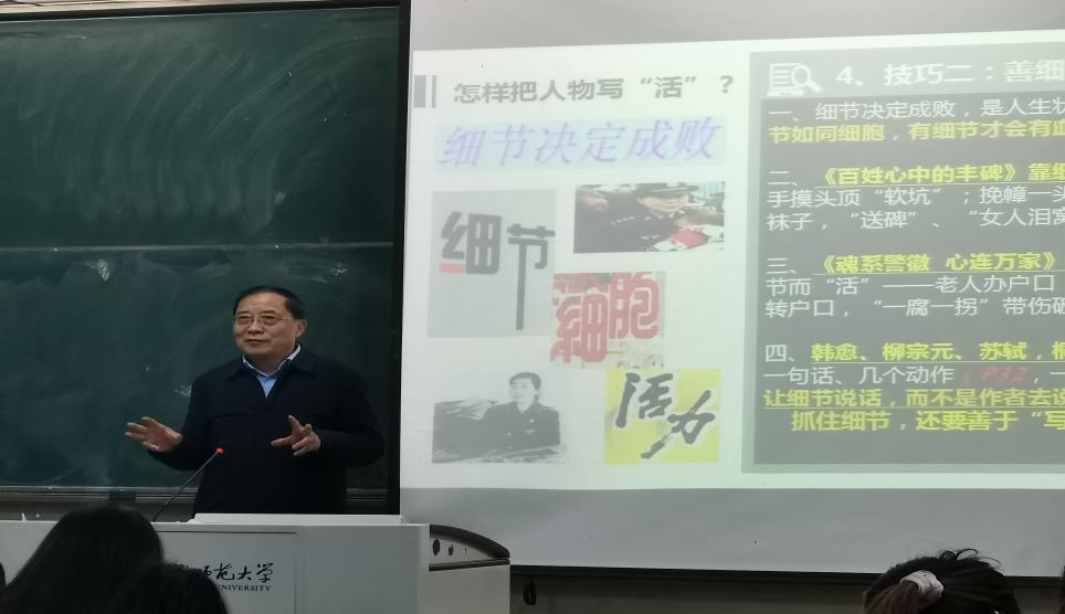 在新闻写实作品上,刘杰老师谈到了多位古文大家笔下的生活中小人物。他说韩愈的《圬者王承福》,赞美王承福的独善其身;他讲柳宗元的《种树郭橐驼传》,感叹这位不知名的种树人的精湛技艺;他谈苏轼的《方山子传》,感慨当时社会对于人才的桎梏。刘杰老师引经据典,从唐宋八大家笔下生动的人物传记讲到司马迁的《史记》,从古文对人物的形象刻画中,带领同学们感受写“活”新闻人物的要义。