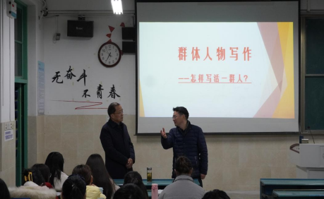 讲座开场,刘杰老师开宗明义:今晚和同学们讨论的重点是如何写活一群人。“人物通讯有写一个人的,有写一群人的。共性是都要注重巧结构、善细节、多手法,用好语言表现人物、展现思想,而不同的是群体人物采写,重点在于突出‘群体性’”。《史记》,凡一百三十篇,书、表外,本纪、世家、列传可以说都是群体人物典范。虽然一些篇章看似偏重一人,总体来看还是群体人物写作。如高祖本纪、项羽本纪、陈涉世家等等,看似突出个体,其实都是群体人物写作。正是每个主体人物周围都有许多不同性格、不同风格的人物,众星拱月,才有众多气势磅礴、主人公刻画传神的名篇。