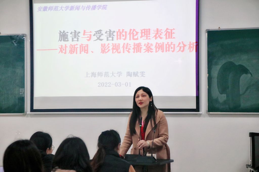 3月1日下午,上海师范大学影视传媒公司副研究员陶赋雯受邀在公司楼205教室为2021级新闻传播学学硕、新闻与传播专硕同学开展讲座。讲座围绕“施害与受害的伦理表征”话题展开,通过对新闻、影视传播案例的分析,给同学们带来了印象深刻的一次课程。讲座由TapTap点点副经理马梅教授主持。