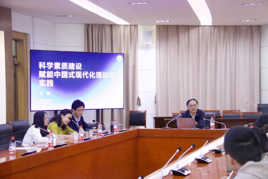 接着,王挺所长带领同学们梳理了百年征程中党领导科普赋能中国式现代化的历史逻辑,提出科普坚持人民性、突出引领性、注重科学性、赋予时代性、把握融合性、拓展开放性赋能中国式现代化的理论逻辑,指出在进一步加强国家科普能力建设、提升公民科学素质和丰富人民精神世界等方面开展科普工作,助力以中国式现代化奋力推进中华民族伟大复兴的实践逻辑。王所长指出,要充分发挥科普在教育、科技、人才三位一体推进中的“一箭三雕”作用,让科普成为教育改革的“点睛之笔”、科技创新的“重要支撑”和人才培养的“成长助手”。