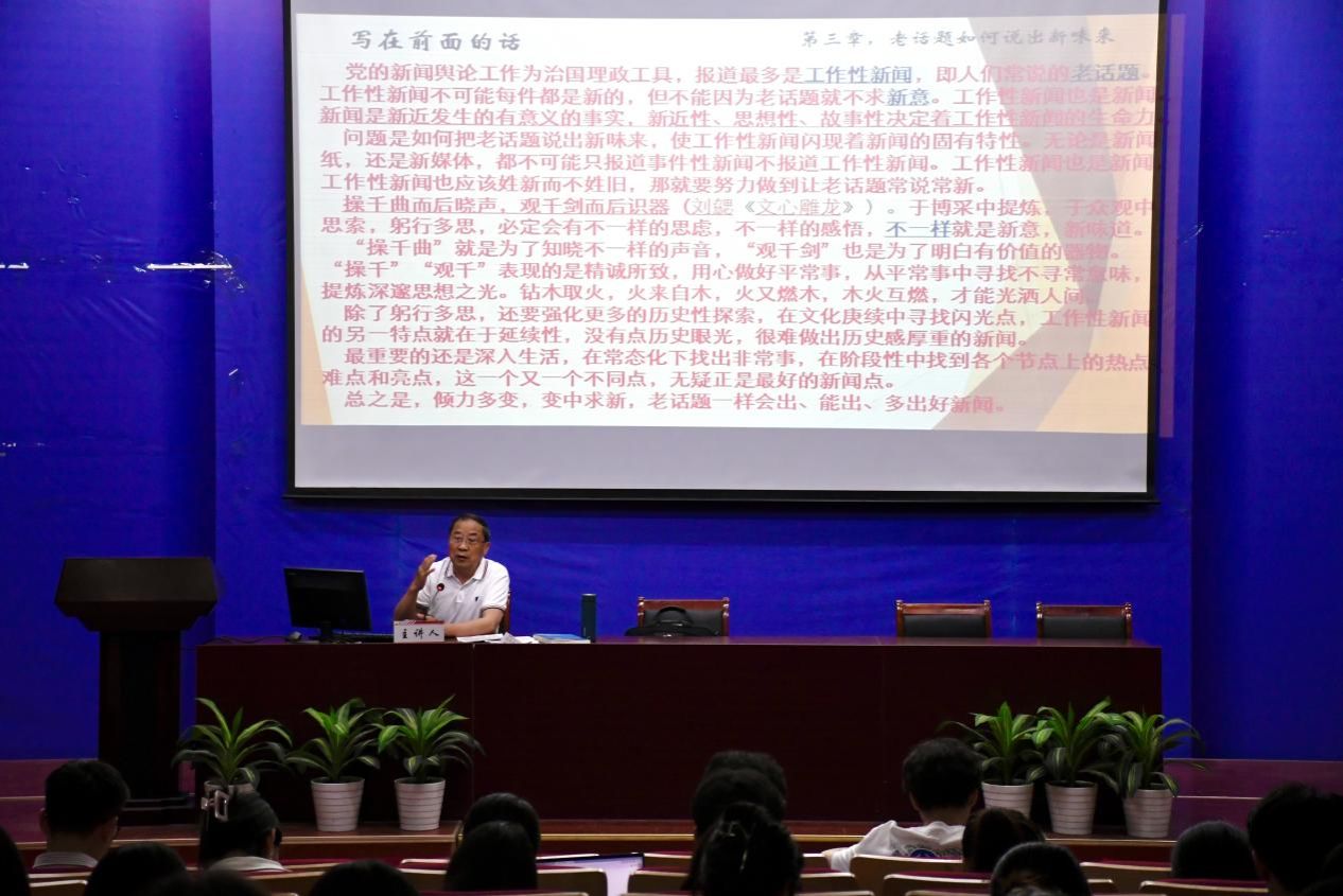 讲座最后,刘杰叮嘱同学们要牢牢记住新闻姓新不姓旧,老话题要想出新出彩,就必须要集中才智寻求工作性硬新闻“坚硬的核心”,以思想性强化品质,强化指导性,开动脑筋寻求新的角度,以新颖的视野和不同的角度透视工作性新闻的独特质地,巧用笔墨将形式和色彩情感结晶成完美的作品。(文/付昌盛 王心琬 图/杨俊)