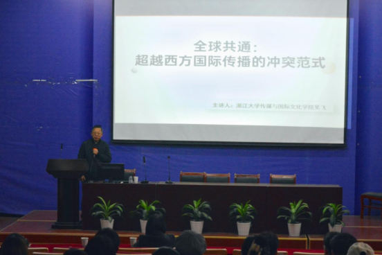 讲座伊始,吴飞教授分享了自己的个人经历,从生活体验的角度引入讲座主题——全球共通。吴飞教授从三个部分展开本次讲座,在第一部分“完美的传播虽不可能,但人类离不开传播”中,他由“传播”一词的含义提出了传播研究的两条脉络,即交流之可能与不可能,他表示“人类为什么传播?理想的交往如何成为可能?共同体为何难以实现?”是传播研究始终在试图解答的核心问题。在第二部分“西方国际传播理论的基本内核:‘文明冲突论’”中,吴飞教授从国际传播的起源与发展出发,介绍了国际传播中的文明冲突论及其他变量。在讲座的第三部分,吴飞教授与大家共同探讨了“国际传播理想的交往如何实现”这一问题,他表示,全球共通需要以最基本的事实共享作为基础、需要在跨国数字平台中促进价值共振、需要强调多元主体情感共鸣。最后,吴飞教授对本次分享进行了总结,再次强调国际传播必须立足于促进个体的成长与发展,才能为构建“各美其美,美人之美,美美与共,天下大同”的未来愿景提供坚实的基础。