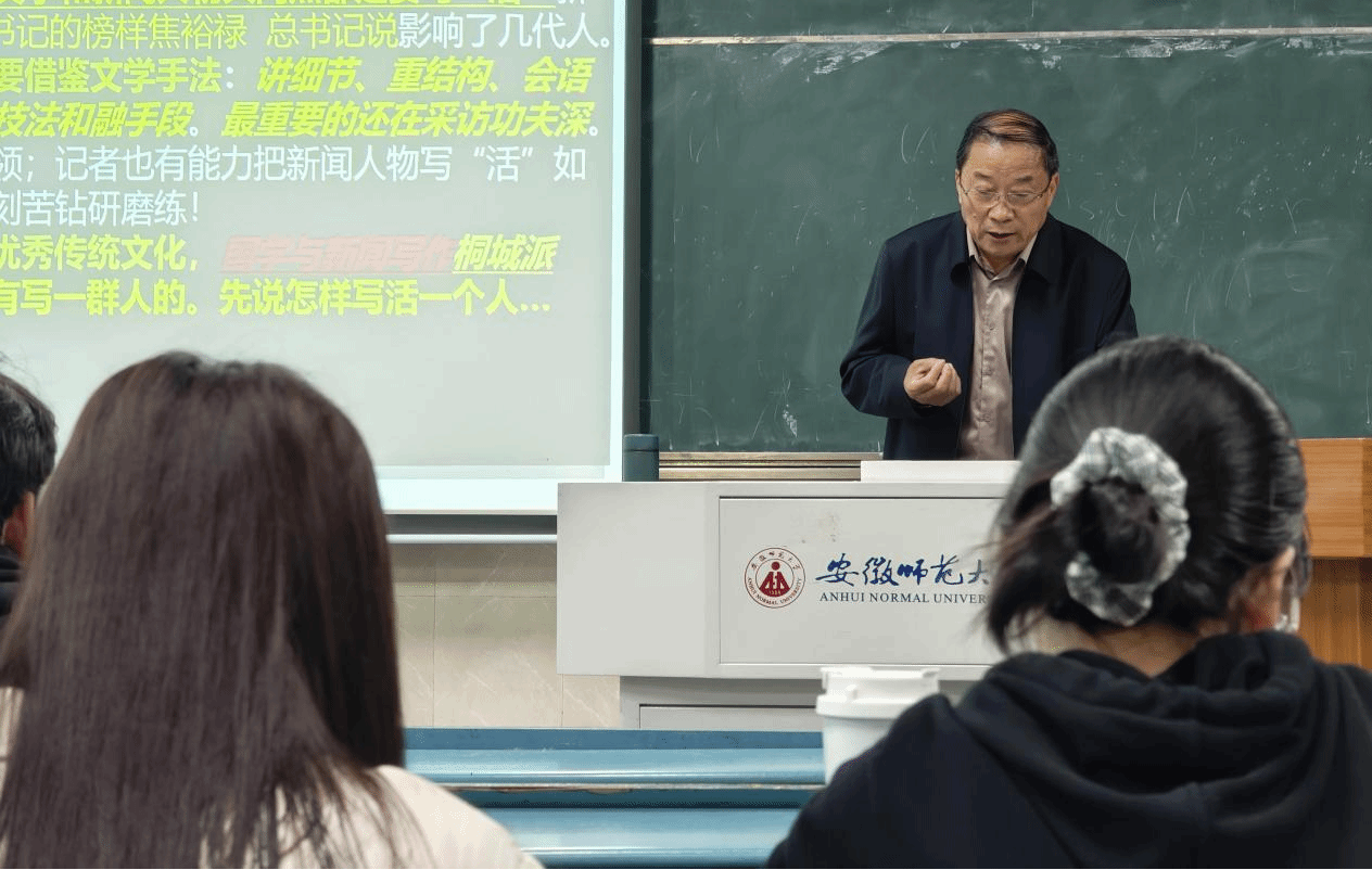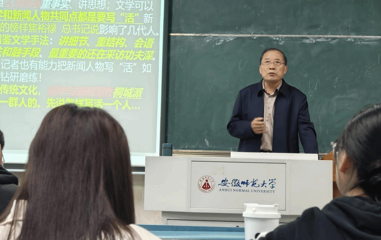 近日,公司特聘教授、人民日报安徽分社原社长、高级记者刘杰在行知楼2010201教室,为2023级新闻专业的同学们带来了一场主题为“国学与新闻学研究、怎样把人物写‘活’”的精彩讲座。此次讲座由新闻学主任张荻主持,2023级新闻学专业全体同学到场聆听学习。