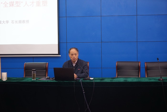 石长顺教授开门见山地指出:在融媒体时代,新闻学子需要拥抱新媒体、树立互联网思维,成为融媒达人。讲座内容围绕“三件大事、三个关键词、三种类型”三大方面有层次地概述了媒体融合的历史以及时代对传媒人才的要求。期间,石长顺旁征博引,以中外传媒业推进媒体深度融合的实例讲解最新的传媒动态。