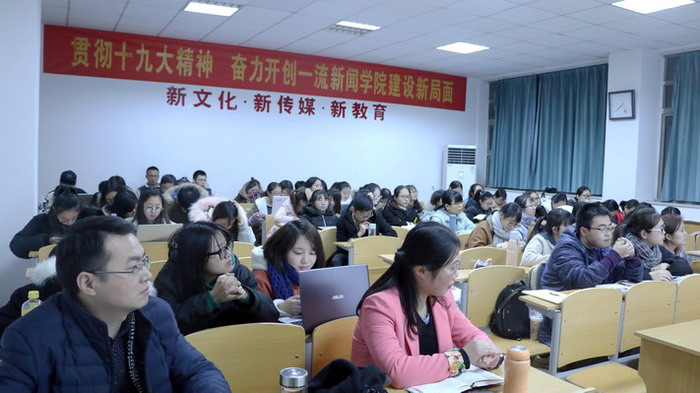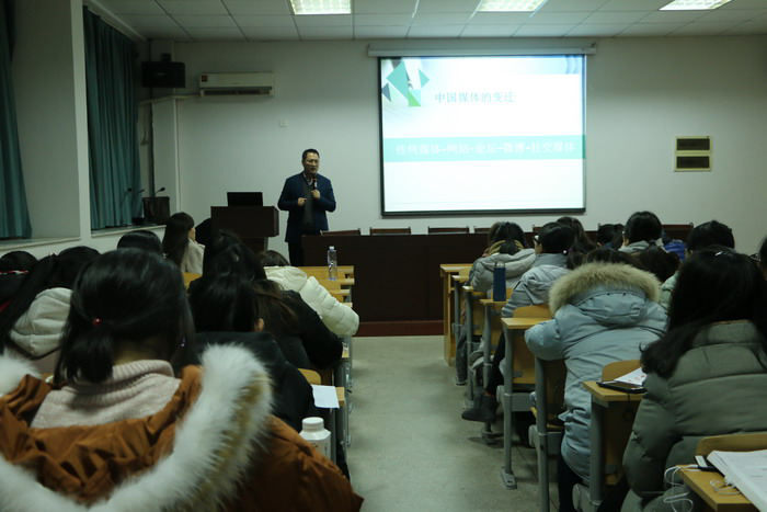 12月18日晚,江苏紫金传媒智库副秘书长燕志华给2016级新闻学全体同学做了一场十分精彩的网络舆情讲座。新闻系主任肖叶飞主持此次讲座,前来聆听的还有副经理马梅、新闻专业教师杨瑾瑜等。
