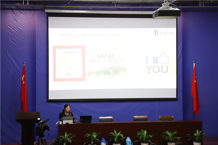 讲座伊始,马梅对讲座做了简洁明了的开场,并和全体师生共同表示对詹新惠的热烈欢迎和感谢。随后,詹新惠一身便装,笑吟吟地和老师同学们打了招呼,便很快进入正题。詹新惠根据自己的经验深入分析两会报道,从网络与新媒体的生态环境与创新网络与新媒体的报道理念两方面进行重点阐述。她首先从政治、经济与民生三个层面谈及互联网发展的基本态势,并提出自己的观点,即新闻传播网络新闻传播进入众媒时代、用户成为网络新闻传播的核心、网络新闻传播样态在改变以及传统媒体探索媒介融合路径的新闻传播的四个生态环境理念。随后,詹新惠展示了今年两会报告的多媒体形式,二维码、词云图、图解、动漫、视频……她以两会为例,实则是在提醒大家如今的网络与新媒体报道理念的变化,强调创新网络与新媒体报道理念的重要性。她认为,5G时代的到来、云计算与云存储的出现、人民在线大数据融媒体平台、“媒体大脑”的突破和应用等一系列现象都昭示着互联网之“新”,并在此基础上分别提出移动与视频优先、精准送达、数据驱动、人工智能协同报道等理念。