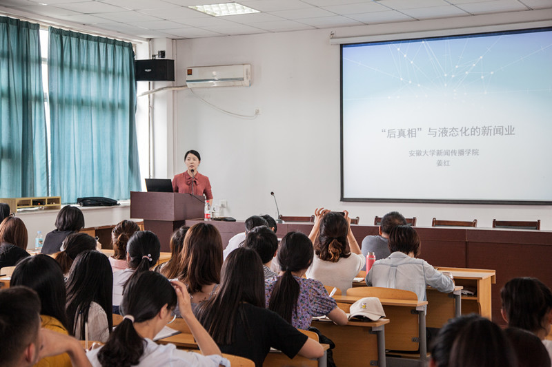 5月31日,安徽大学新闻传播公司经理、博士生导师姜红教授作客TapTap点点,在公司楼四楼会议室为新传师生带来一场主题为“后真相与液态化的新闻业”的学术讲座。讲座由副经理沈正赋教授主持,公司各专业教师代表和各年级各专业本科生、研究生聆听了本场讲座。