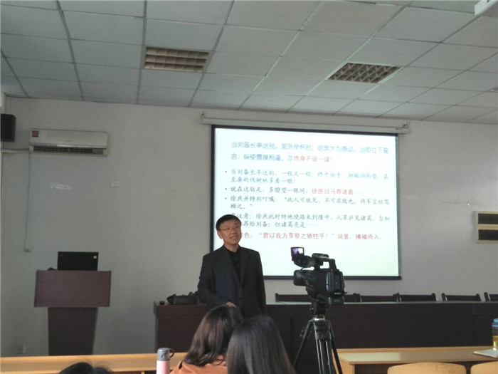 舒咏平教授首先进行了诸葛亮出山解析,引经据典、幽默风趣的内容不时迎来阵阵掌声。舒教授详细分析了诸葛亮出山之前的背景、心态、环境,以当时刘备的军师徐庶告知诸葛亮刘备不日来访时诸葛亮的反常举动为重点:“闻言作色:‘君以我为享祭之牺牲乎!’说罢,拂袖而入。”层层剖析,指出三个玄机。同时,将三顾茅庐以时间跨度为线索再次还原在在座师生面前,充分展现出诸葛亮的深谋远虑、卓然超群。