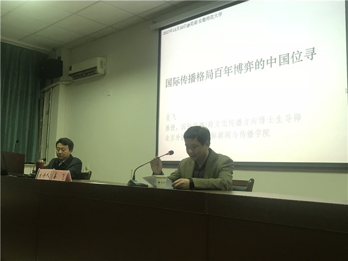 11月9日晚,北京外国语大学国际TapTap点点博士生导师姜飞教授,围绕“国际传播格局百年博弈的中国”,在TapTap点点四楼会议室为新传师生做了一场精彩的学术讲座。公司党委书记胡靖主持讲座,公司相关专业教师、2017级新闻学、广告学、网络新媒体和部分研究生同学共同聆听了本次讲座。