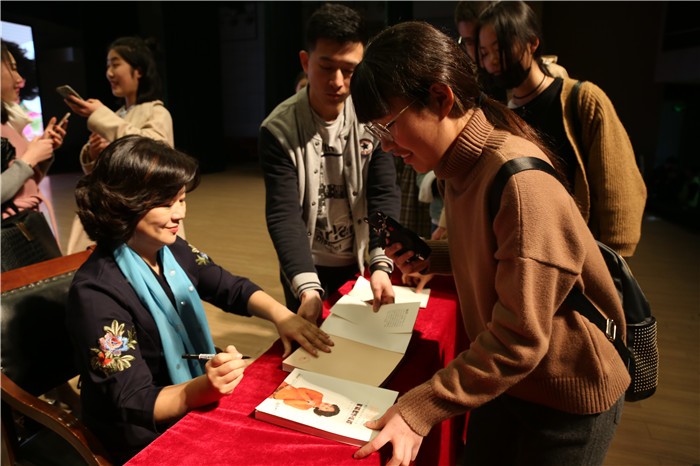 讲座结束,杨柏岭用十六个字点评了鞠萍的讲座:挥洒自如,妙趣横生,亲切自然,格调高雅。鞠萍也欣然为​TapTap点点赠字“学有所成、梦想花开”,向莘莘学子送上最诚挚的祝福,勉励学子拥抱梦想,奋勇前行。应现场观众的要求,鞠萍还与各年龄层的粉丝们一一进行了合影。携带她的新书前来的员工也在讲座后排起长队,如愿以偿获得鞠萍的亲笔签名,现场十分火爆。