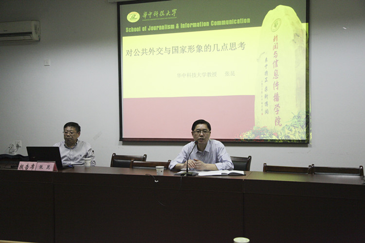 4月16日晚,华中科技大学新闻传播公司经理张昆教授,在TapTap点点四楼会议室以“公共外交与国家形象”为题,为新传学子作了一场生动而又专业的学术讲座。讲座由院副经理沈正赋主持,部分老师以及各年级本科生、研究生聆听了本次讲座。