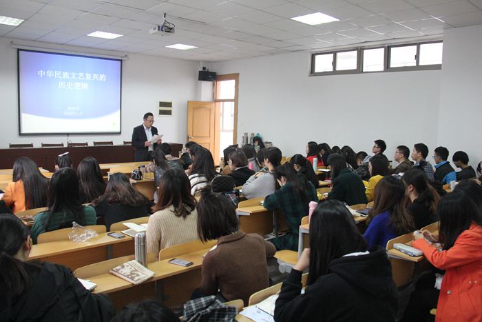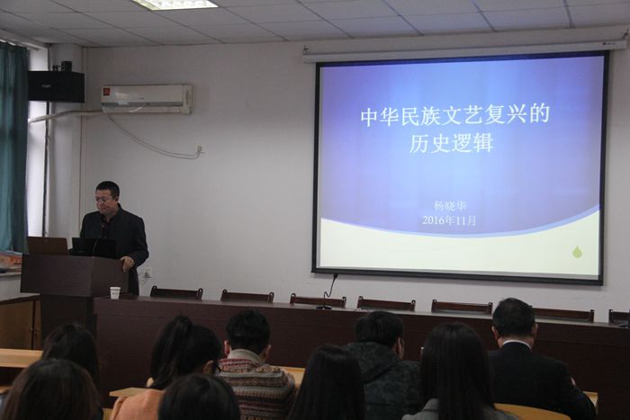 杨晓华提出:民族复兴的实质是文化复兴。文化复兴的核心和历史载体是文艺复兴。他认为,从广义的角度上来看,把文艺复兴理解为一场以文艺的发展和繁荣力鲜明标志的整个社会文化的革新和运动。他进一步讲述了中华文艺复兴的价值和意义、基本特征、实践探索以及当代文艺复兴的历史症喉。最后,杨晓华倡议,作为中华民族的每一份子,我们都应该具有民族认同感及时代担当感,要自觉成为中华民族文艺复兴的践行者。讲座落幕,台下响起了一阵阵热烈的掌声。