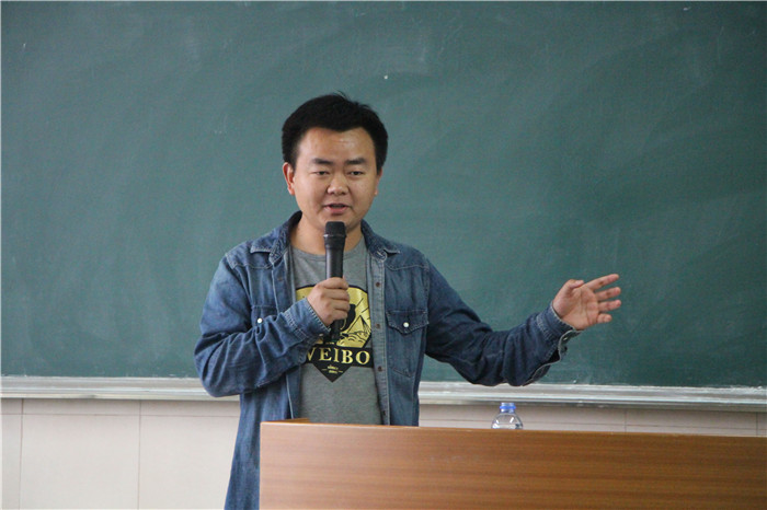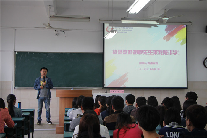 讲座开始后,胡静先引导同学们讨论不同时代的网络热词,由此窥见从互联网到移动互联网的时代发展。接着,他讲述了从1.0门户时代到4.0众媒时代的变迁,分析了当下网络媒介载体的多元化现象。他由直播现象为例,告诫同学们不要局限对媒体和媒介的概念认知。他认为搜狗、陌陌 、美图秀秀等平台甚至个人的微信、微博账号都可以被称为媒体。他强调如今的媒体和媒介正在不断外延与无限扩大,能把信息传播出去的东西就是媒介。