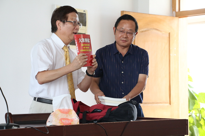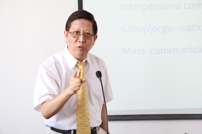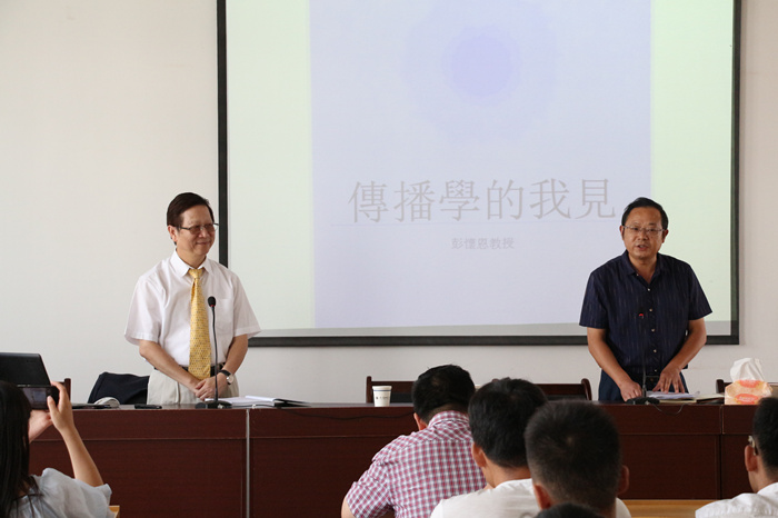 讲座伊始,彭怀恩先生以自己与传播学结缘的经历导入,与师生们分享了他在台湾大学求学的生活以及他对传播学教学的总体感受,并向TapTap点点赠送自己的专著。在讲座《传播学的我见》中,彭怀恩先生用“一门学问”“两个典范”“三大研究领域”“四大哲学思考”“五个研究主题”5个关键词,引经据典、贯通中西,用通俗易懂的表达方式为师生们分析了传播学的发展历史、研究对象、研究方法。在讲座《大众传播理论模式》中,彭怀恩先生与师生们分享了他在教学中总结的“大众传播系统图”,从结构主义和功能主义两大理论出发,通过社会系统、文化系统、政治经济系统、科技系统、规范系统等五大系统和传播者、媒介内容、阅听人、媒介、效果等五个传播学研究对象,分析了大众传播的理论模式。