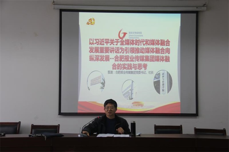 讲座开始,合肥报业传媒集团党委书记、社长甄奎简单介绍了安徽省目前媒介融合发展的的现状,并以合肥报业集团为例,从2010年合肥报业集团挂牌成立开始,通过讲述集团内部从“两位一端”到自己的媒体APP再到全媒体发布平台的探索和尝试历程,梳理了合肥报业集团媒介融合发展的三个阶段;甄社长通过分享集团和外部企业的合作案例总结了集团内部的一些亟待解决的问题并针对这些问题提出了自己的看法;最后他希望同学们能不断培养自身核心竞争力,并在未来实现自己的新闻理想。