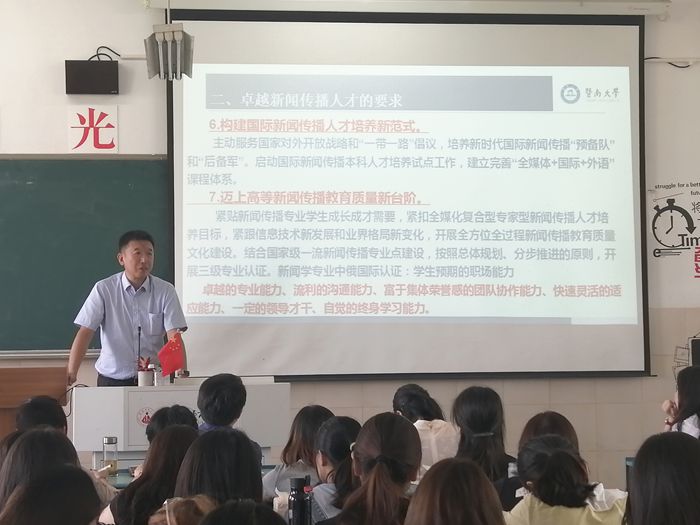 张晋升教授以新时代呼唤卓越新闻传播人才开题,强调了新时代下新闻传播学教育更应当将马克思主义贯穿到新闻理论研究、新闻教学中去。他引用习近平总书记在新闻舆论工作座谈会上的重要讲话,提出要使新闻学真正成为一门以马克思主义为指导的学科,使学新闻的员工真正成为牢固树立马克思主义新闻观的优秀人才。他说:“要警惕以新闻专业主义面目出现的西方新闻观,推动马克思主义新闻观进教材进课堂进头脑,入心入行。”张教授以中美贸易战和美国总统大选的新闻报道作品为例,深入浅出地辨析了中西方新闻观的差异。
