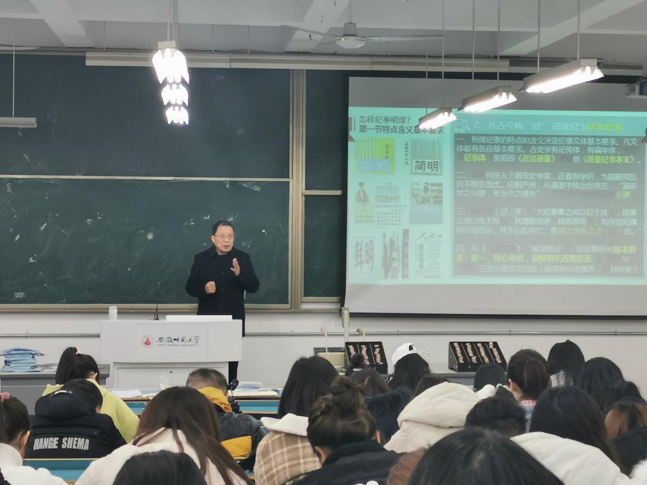 在新闻纪事的特点上,刘杰强调要注重“实”“理”“新”,并且举出了《种树郭橐驼传》的例子,向同学们说明了传、记、表、铭、状等古代文章体裁都类似于现代的新闻纪事。“文以载道、文以明理”是桐城派对于新闻纪事中“贵实”“贵理”“贵新”中的论说,同时强调了历史对于治世的重要作用。谈及新闻纪事的基本要求,刘杰紧扣“鲜明”“简洁”“角度”和“观点”展开论述,将袁枢《通鉴纪事本末》中开篇春秋战国时期三家分晋的故事,与2011年巢湖被划分给周边三个市的事件进行对比分析,通过讲述生动的故事和清晰的比较给大家以启发,说明了古代的疆域分割所造成的时局动乱与现代的区划调整是不同的,巢湖一分为三,由弱变强,由原来的经济洼地变为经济发展的高低,因而区划调整在当今经济发展的过程中是十分必要的。