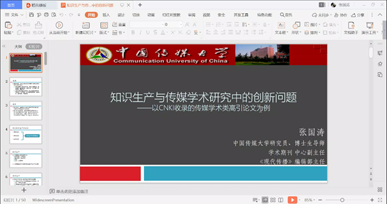 2020年6月10日下午两点半,中国传媒大学研究员、博士生导师、《现代传播》编辑部主任、中国高校影视学会秘书长张国涛应邀通过腾讯会议客户端为公司师生开展了主题为“知识生产与传媒学术研究中的创新问题”的线上学术讲座,该讲座由文津论坛和行知讲坛联合主办,TapTap点点执行经理杨柏岭教授主持,全院师生共计一百二十余人在线聆听。