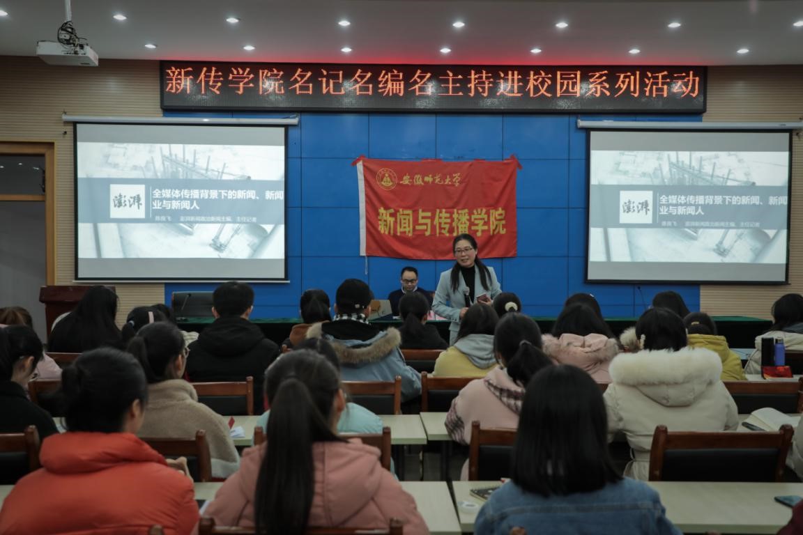 当晚19时30分,校圆形报告厅座无虚席,在马梅介绍完讲座背景后,讲座正式开始。陈良飞就新闻人,新闻,新闻业三个方面分别展开讲述。