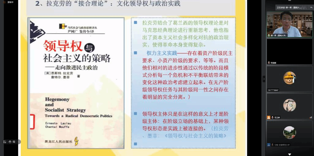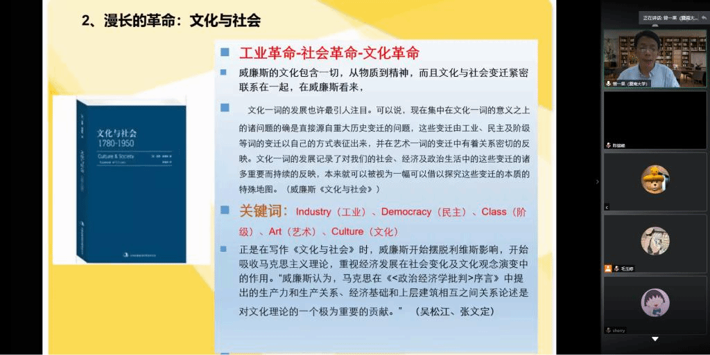 在谈到文献性文化的意义时,曾一果又运用威廉斯“文化唯物主义”相关理论从三个层面剖析,从而得出了“当活着的见证人归于沉默时,没有什么东西能比它更清晰地将生活直接呈现在我们面前”这一极具现实性意义的结论。此结论也引发了在线的听众们的强烈共鸣。讲座还提到了“感觉结构”“多元社会理论与重构社会主义凝聚力”等文化唯物主义的典型理论。