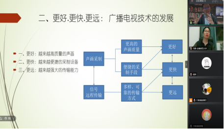 周勇经理首先以马克思、恩格斯的名言进行引入讲座,详细讲解了从照相术到如今的5G传输技术的百年视听技术的发展史。“全部视听传播技术的发展史,就是视听信息生产质量和传输能力不断提升的历史”。讲座内容的大框架为:一、视听传播时代的到来:广播电视的诞生;二、更好.更快.更远:广播电视的发展;三、视听新技术与多元视听传播格局。周勇经理语言逻辑清晰,PPT图文并茂,生动的向同学们讲解视听传播技术的演进与发展。此外,周勇经理还向同学们建议,希望新闻专业的员工能够成为“一专多能”的人,既要有全媒体能力,也要守住自身的独特性。