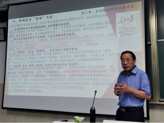 老生常谈的老话题如何写出新意,让人爱看? 6月16日晚7:30,人民日报社安徽分社原社长、人民日报高级记者刘杰为2018级、2019级的新闻学专业的“小新”们进行了一场别开生面的“头版头条的写作艺术——老话题如何写出新味来”学习交流活动。