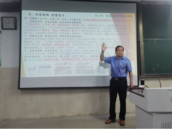 “操千曲而后晓声,观千剑而后识器”。 “生活中有太多问题反反复复,新闻不可能次次都新,比如关于农业也要创品牌的问题,二十多年前就喊出了这个口号,但搁到现在也不过时啊,农业问题不论什么时候也都是关乎老百姓吃饭的大事哇。”刘杰社长深情动容,并从“精诚而为出新意”、“破解理财之政历史难题”、“农业也要创品牌”、“持续探索化解增收之愁”、“谋深谋细,谋势落子”、“新闻学要有坚硬的内核”等六个方面,阐述新闻永远在路上的故事。一份ppt、一本老书、一杯水、几张老报纸复印稿与讲义,在讲台一站就是三个小时,刘社长讲课声音不算很大,但如同讲故事般娓娓道来。每次的“刘杰故事汇”,都是在刘杰社长四十余年的记者生涯、作为新闻工作者的经历经验基础上凝炼而成。“听刘杰社长的如何写好“头版头条”的课程,课短情长,富有家国情怀,让我感受到了当好一名记者也是能为社会国家做许多有贡献的事。”2019级新闻学专业的候博文说道。