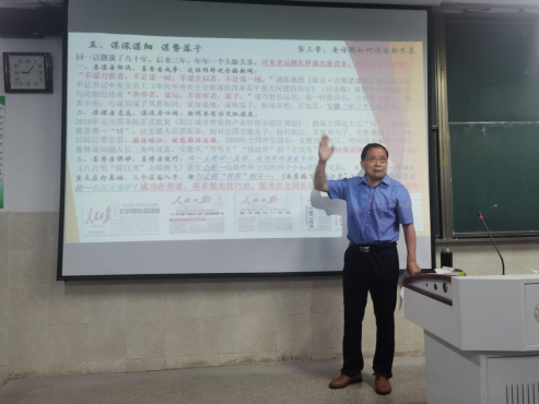 “操千曲而后晓声,观千剑而后识器”。 “生活中有太多问题反反复复,新闻不可能次次都新,比如关于农业也要创品牌的问题,二十多年前就喊出了这个口号,但搁到现在也不过时啊,农业问题不论什么时候也都是关乎老百姓吃饭的大事哇。”刘杰社长深情动容,并从“精诚而为出新意”“破解理财之政历史难题”“农业也要创品牌”“持续探索化解增收之愁”“谋深谋细,谋势落子”“新闻学要有坚硬的内核”等六个方面,阐述新闻永远在路上的故事。一份ppt、一本老书、一杯水、几张老报纸复印稿与讲义,在讲台一站就是三个小时,刘社长讲课声音不算很大,但如同讲故事般娓娓道来。每次的“刘杰故事汇”,都是在刘杰社长四十余年的记者生涯、作为新闻工作者的经历经验基础上凝炼而成。“听刘杰社长的如何写好头版头条的课程,课短情长,富有家国情怀,让我感受到了当好一名记者也是能为社会国家做许多有贡献的事。”2019级新闻学专业的候博文说道。
