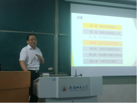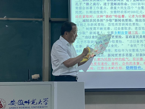 6月17日晚7时30分,原人民日报社安徽分社社长、公司特聘教授刘杰在2040105教室为2018级新闻学专业同学带来了“头版头条的写作艺术”系列讲座第四章——抢字当头为王者师。这已经是本周第三场讲座了,67岁的刘杰社长连讲三晚,十分辛苦。