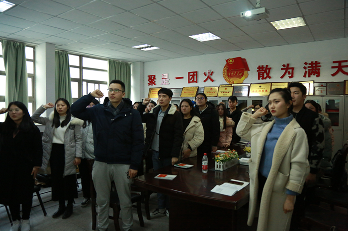 随后,在党支部书记余梦雅的带领下,2018年下半年新发展的9名党员面对入党誓词,高举右拳,庄严宣誓:“我志愿加入中国共产党,拥护党的纲领,遵守党的章程,履行党员义务......”一字一句,铿锵有力,支部其他党员也一起重温了入党誓词,接受了一次精神上的洗礼。2015级网络与新媒体专业的周普同学表示在今后会进一步完善自己,不仅仅在组织上入党,还要在思想上时刻牢记自己的党员身份,以一名优秀共产党员的标准严格要求自己。