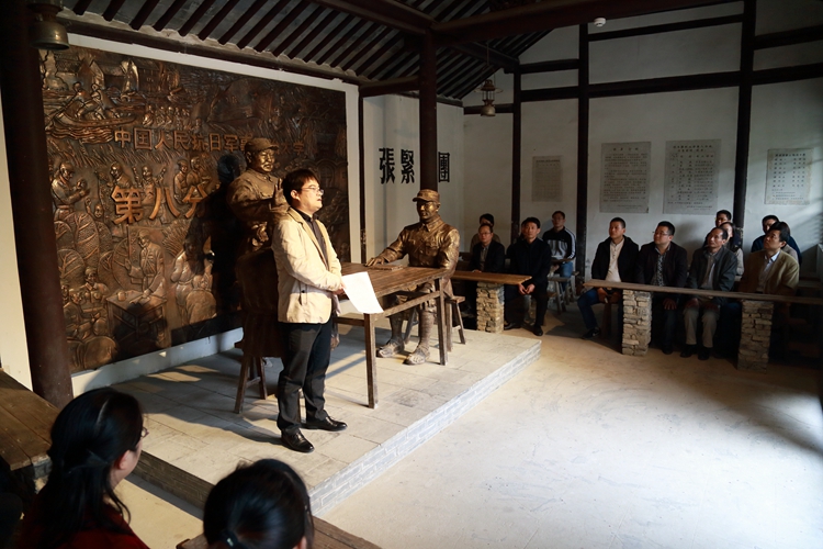 抗大八分校旧址位于天长市千年古镇龙岗,美丽的高邮湖畔。走进小镇,映入眼帘的是高大的碉堡炮楼和先烈们战斗使用过的飞机、大炮和坦克,再现了一幕幕烽火连天的战争场景。党员们沿着先烈们的红色足迹,先后参观了抗大八分校纪念馆、校务处、训练处、政治部、锄奸科、地道、粟裕居处等旧址,走进八路军当年上课的课堂、训练的场地、睡觉的卧室、治病的医院、走过的地道,了解抗大的校训、办学理念和上课内容。虽然条件艰苦,环境恶劣,但新四军在这里度过了艰苦卓越的抗战岁月,留下了军民鱼水的动人佳话,透过陈列馆透明的玻璃橱窗,一个个永垂不朽的名字、一张张尘封模糊的照片、一件件锈迹斑斑文物、一段段记录历史的文字说明材料,我们可以感受到先烈们艰苦奋斗、不怕牺牲的革命乐观主义精神。
