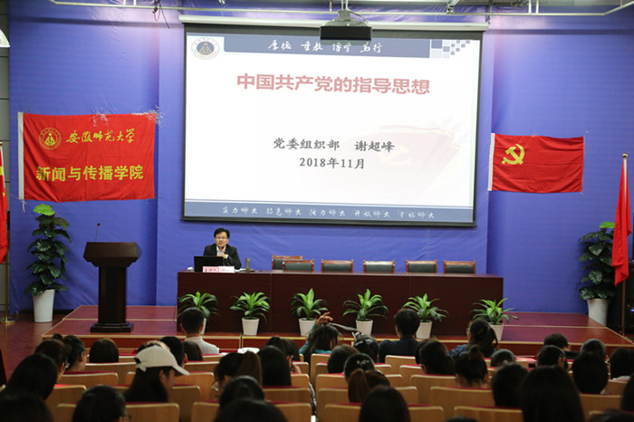 谢超峰从党的指导思想的主要内容和如何学习、践行党的指导思想两个方面进行讲述。谢超峰重点梳理了党的指导思想发展历程,他结合史实和身边有趣的小故事生动地解读了马克思列宁主义、毛泽东思想、邓小平理论、“三个代表”重要思想、科学发展观和习近平新时代中国特色社会主义思想的深刻内涵,使得整场讲座妙趣横生,笑声连连。